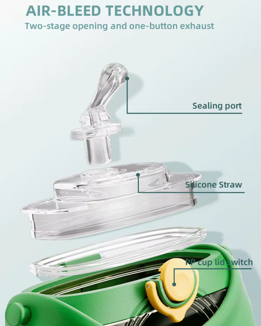 Food-Grade Silicone (Straws & Seals):Soft, flexible, and non-toxic. This material creates our leak-proof seal, is gentle on gums, and is easy to clean.